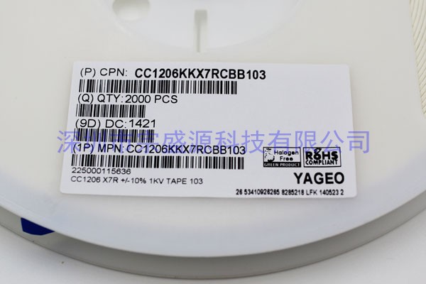 產品名稱:YAGEO電容 1206 1000V 0.01UF CC1206KKX7RCBB103