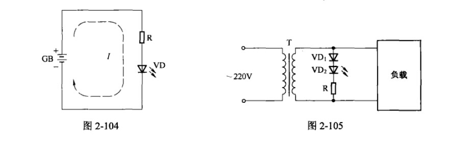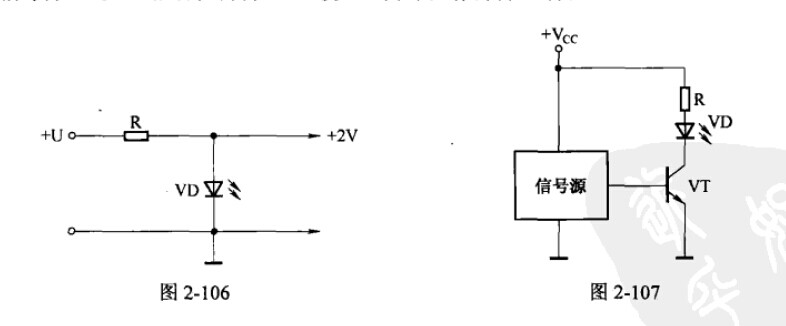 1、發光二極管用作指示電路。發光二極管的典型應用電路如圖2-104所示,R為限流電阻,I為通過發光二極管的正向電流。發光二極管的管壓降一般比普通二極管大,約為2V,電源電壓必須大于管壓降,發光二極管才能正常工作。