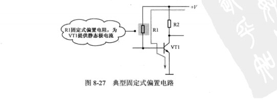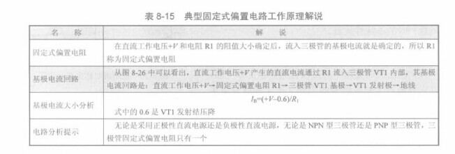 如圖8-27所示是典型固定式偏置電路。電路中的VT1是NPN型三極管,采用正極性電源+V供電。如表8-15所示是典型固定式偏置電路工作原理解說。