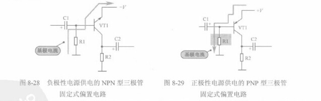 如圖8-28所示是負極性電源供電的NPN型三極管固定式偏置電路。電路中的VT1是NPN型三極管,-V是負極性直流電源,R1是基極偏置電阻,R1構成VT1的固定式基極偏置電路,R1可以為VT1提供基極電流。基極電流從地線(也就是電源的正極端)經R1流入三極管VT1的基極。