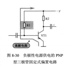 如圖8-30所示是負極性電源供電的PNP型三極管固定式偏置電路。電路中的VT1是PNP型三極管,-V是負極性直流電源,R1是基極偏置電阻,R1構成VT1的固定式基極偏置電路,R1可以為VT1提供基極電流。基極電流是從地線流入發射極,從基極流出再經R1到達負電源-V端。