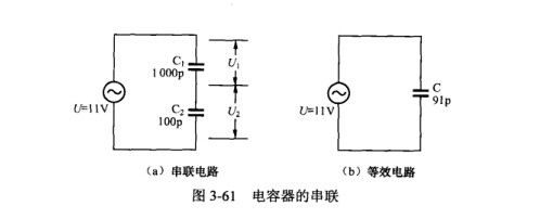 兩只或兩只以上的電容器在電路中頭尾相連就是電容器的串聯。電容器的串聯如圖3-61所示。