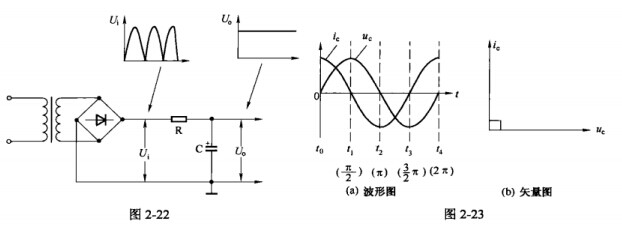 (2)旁路濾波。電容器可以將電壓中的交流成分濾除。圖2-22所示為整流電源電路,二極管整流出來的電壓U1是脈動直流,其中既有直流成分,也有交流成分,由于輸出端接有濾波電容器C,交流成分被C旁路到地,輸出電壓U。就是較純凈的直流電壓了。