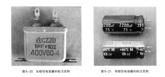 ②電容器的標注方法 下面具體看一下電容器的標注方法。在實際電容器表面,也可以找到與電子電路圖中對應的標識信息,通常標識有電容器的電容量,有極性的電容器還標有負極性。下面選取典型電容器分別介紹電容器實物的標識方法。