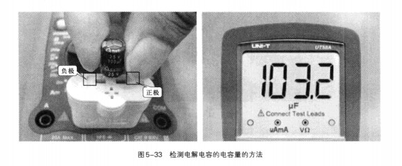 電解電容器電容量的檢測(cè)方法見圖5-33。